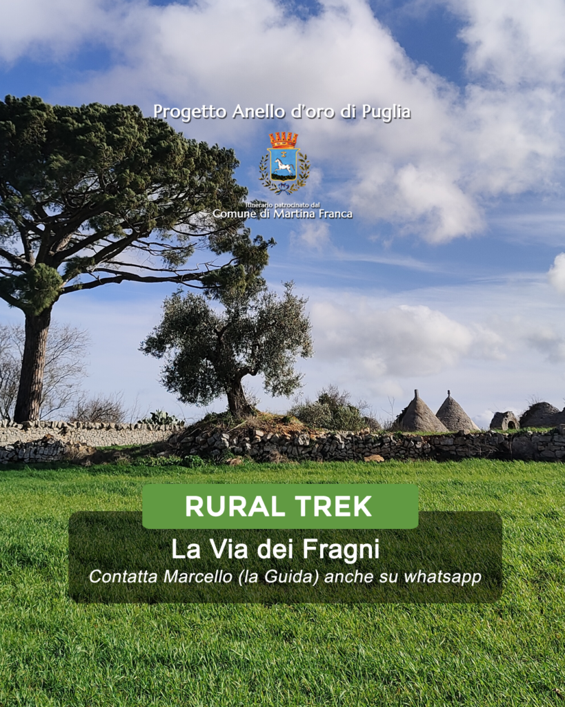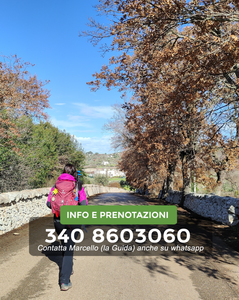 La tappa inizia dalla imponente Basilica di San Martino di Tours e, attraversando i suggestivi vicoli del centro storico, ci dirigeremo alla periferia del borgo in direzione della Chiesa di Sant’Antonio ai Cappuccini. Sin dalla partenza, tratturi, muretti a secco, trulli e masserie testimoniano la civilizzazione contadina fuori dalle zone urbane in un continuo alternarsi di paesaggi, colori ed incredibili esemplari di Fragno (Quercus trojana) che, nonostante la grande antropizzazione, conservano il fascino di una Puglia arcaica e magica che sopravvive alle aggressioni della modernitร .