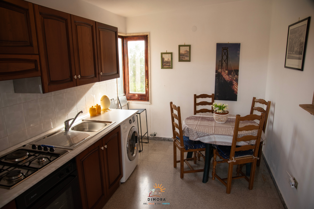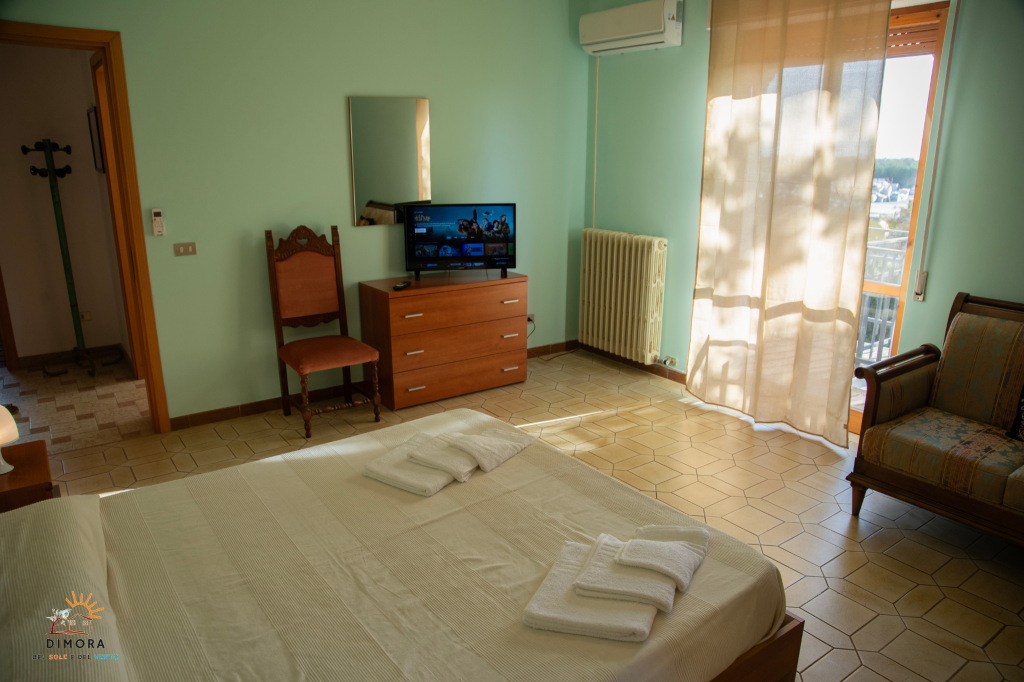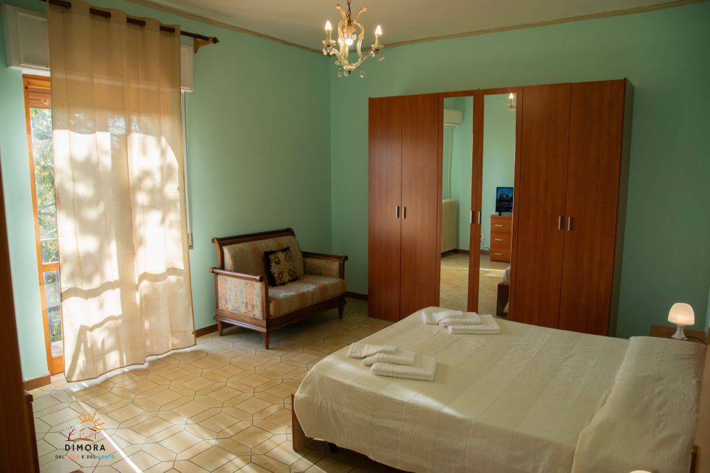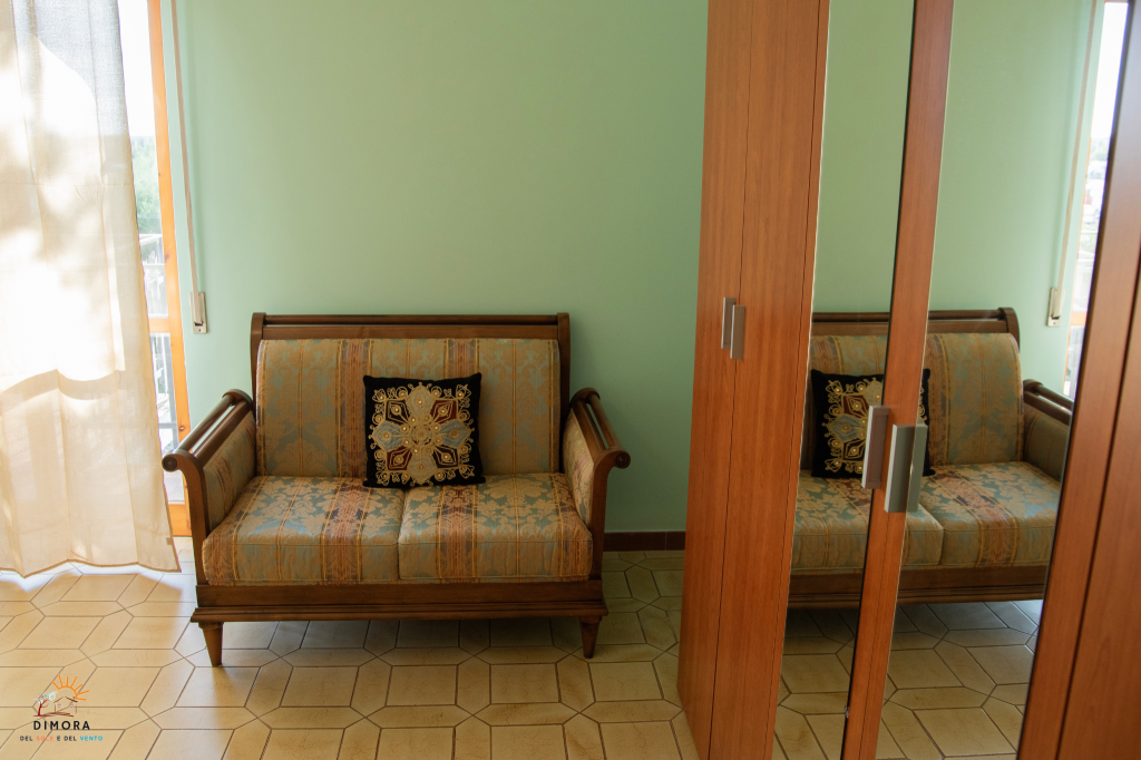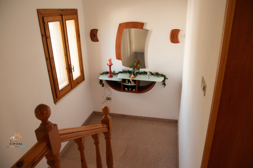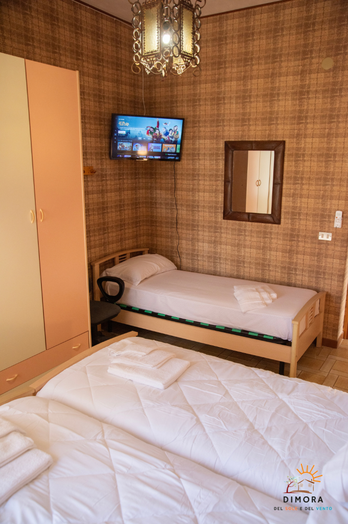 Adatto per coppie, gruppi o famiglie, l’alloggio turistico “DIMORA DEL VENTO E DEL SOLE” è ubicato al primo piano di una villetta bifamiliare con ampio giardino ed ingresso autonomo e riservato. Può offrire ospitalità ad un massimo di 8 persone ed è composta da ingresso, camera matrimoniale con possibilità di letto aggiunto, stanza da letto con 3 letti singoli, soggiorno con divano letto matrimoniale, cucina, bagno, due balconi e piccolo terrazzino, ambienti climatizzati, TV Smart in ogni stanza e connessione wi-fi, parcheggiogratuito.