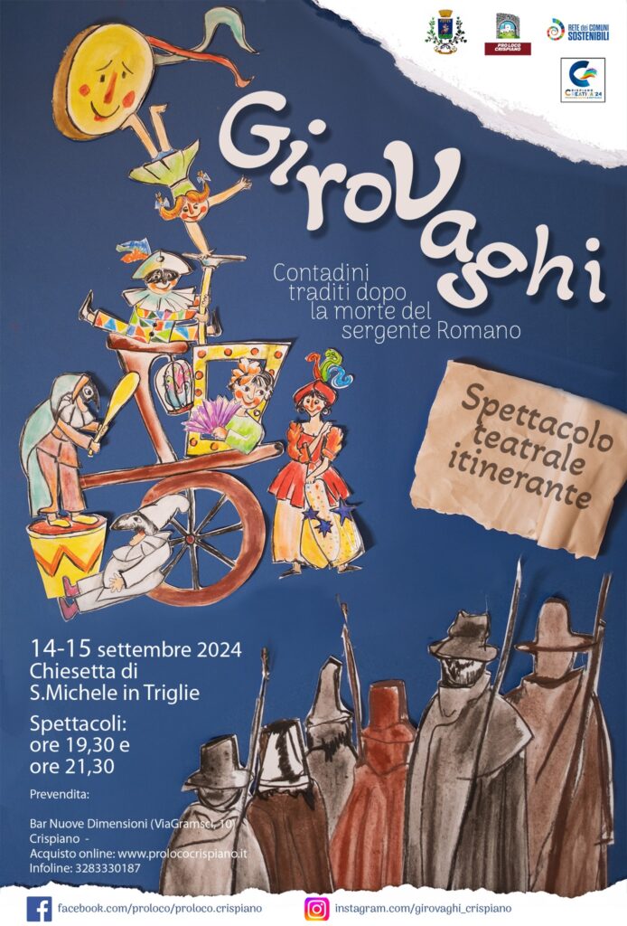 β€œGirovaghi” Γ¨ uno spettacolo teatrale itinerante che celebra la forza di chi non si arrende e fa riflettere sul valore della libertΓ  e della dignitΓ , il tutto accompagnato da note di sottile ironia.