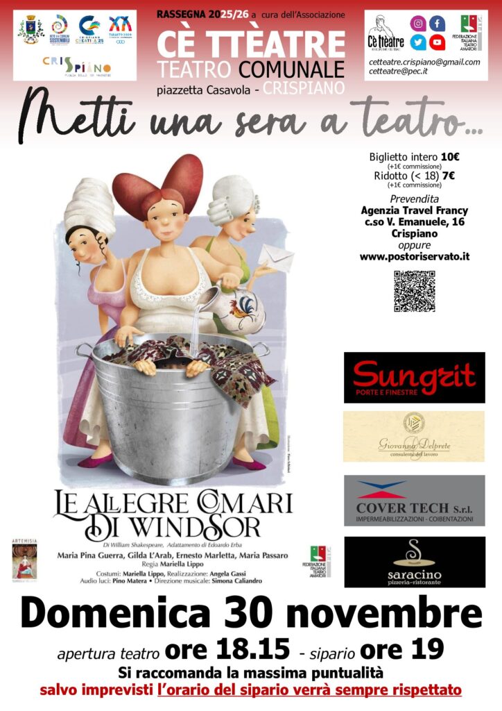 Nel secondo appuntamento della Rassegna Teatrale “Metti una sera a teatro…” saranno protagoniste “Le allegre comari di Windsor”, in un riadattamento della commedia di William Shakespeare.