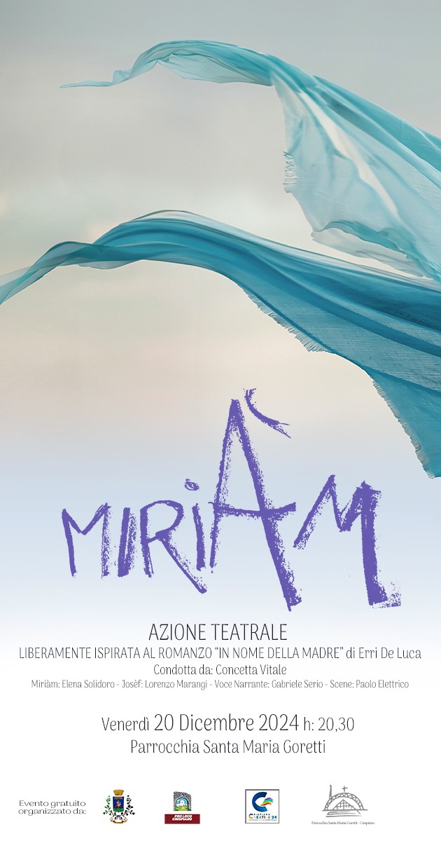 Azione teatrale liberamente ispirata al romanzo in “nome della Madre” dello scrittore Erri De Luca. Miriam, questa azione teatrale, è incentrata su una ragazza ebrea che si trova ad essere chiamata a diventare madre del figlio di Dio. L’intento è quello di mettere in risalto l’aspetto umano e realistico di questa storia, il coraggio. le emozioni e le sofferenze di Mirìam, l’amore profondo di una madre per un figlio.