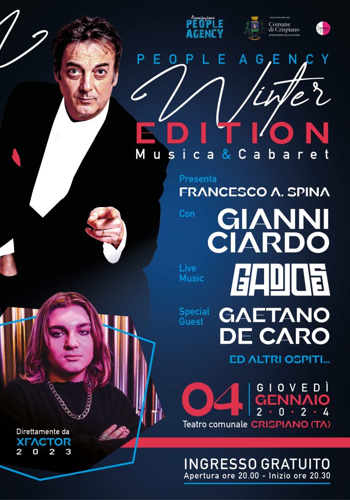 Nella splendida cornice del Teatro Comunale di Crispiano (Ta) saranno con noi il grande GIANNI CIARDO, icona della comicità pugliese e Re della risata e direttamente dal palco di X FACTOR 2023 la rivelazione di questa edizione GAETANO DE CARO. Il tutto sarà contornato dalla musica dei GADJOS, band che sta riscuotendo consensi in tutta la Puglia! Presenterà la serata Francesco Andrea Spina (Elegance).