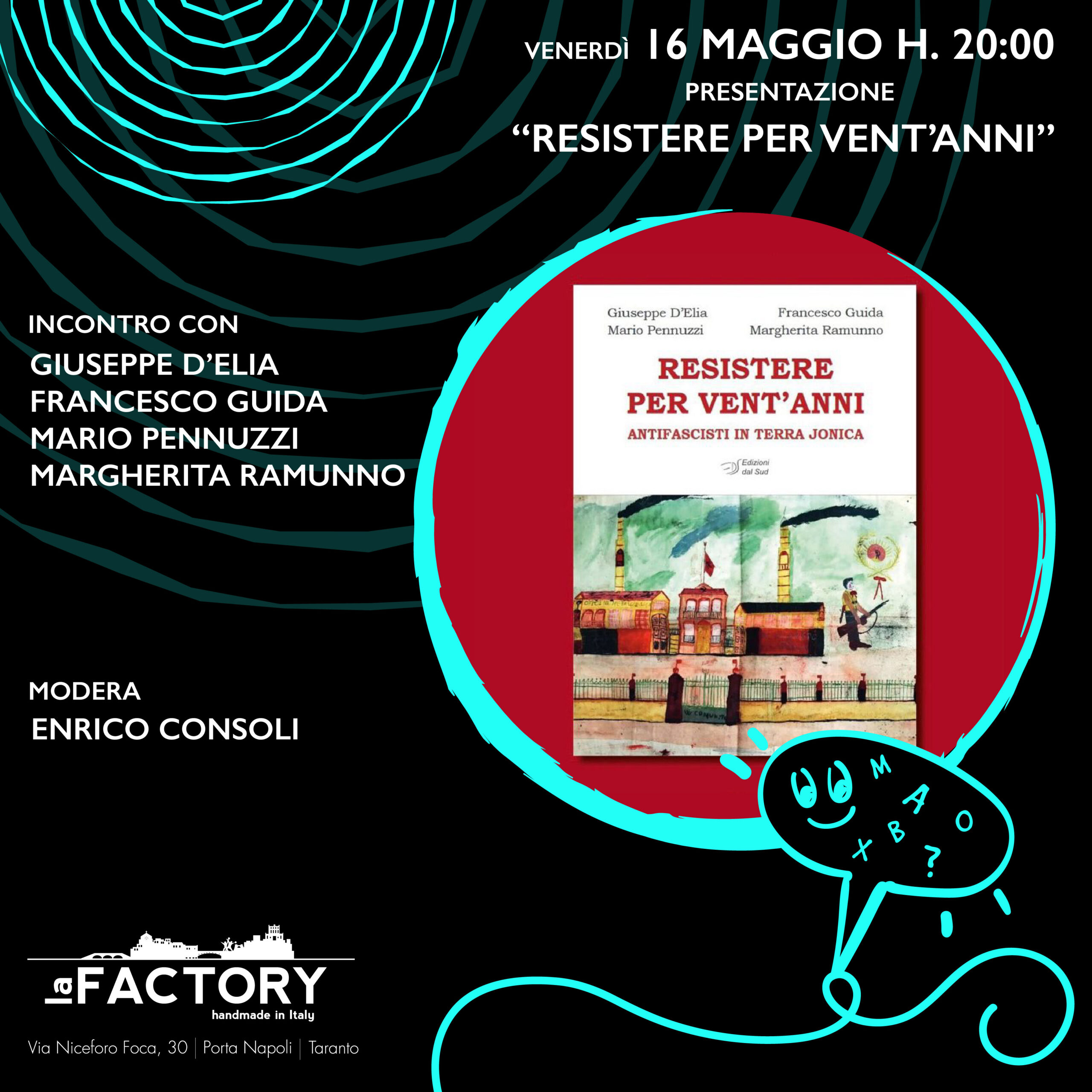 La Factory, spazio indipendente per l’autoproduzione e la cultura, ospita la presentazione del volume “Resistere per vent’anni – Antifascisti in terra jonica”, Edizioni dal Sud, pubblicazione collettiva che riporta alla luce storie e volti dell’antifascismo locale durante il ventennio mussoliniano e oltre.