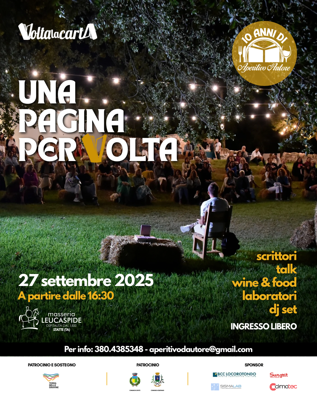In occasione dei dieci anni del format Aperitivo d’Autore, abbiamo organizzato un evento speciale per celebrare questi anni meravigliosi di libri e incontri indimenticabili, di posti stupendi ed eccellente enogastronomia. Lo abbiamo intitolato Una pagina per Volta – 10 anni di Aperitivo d’Autore.